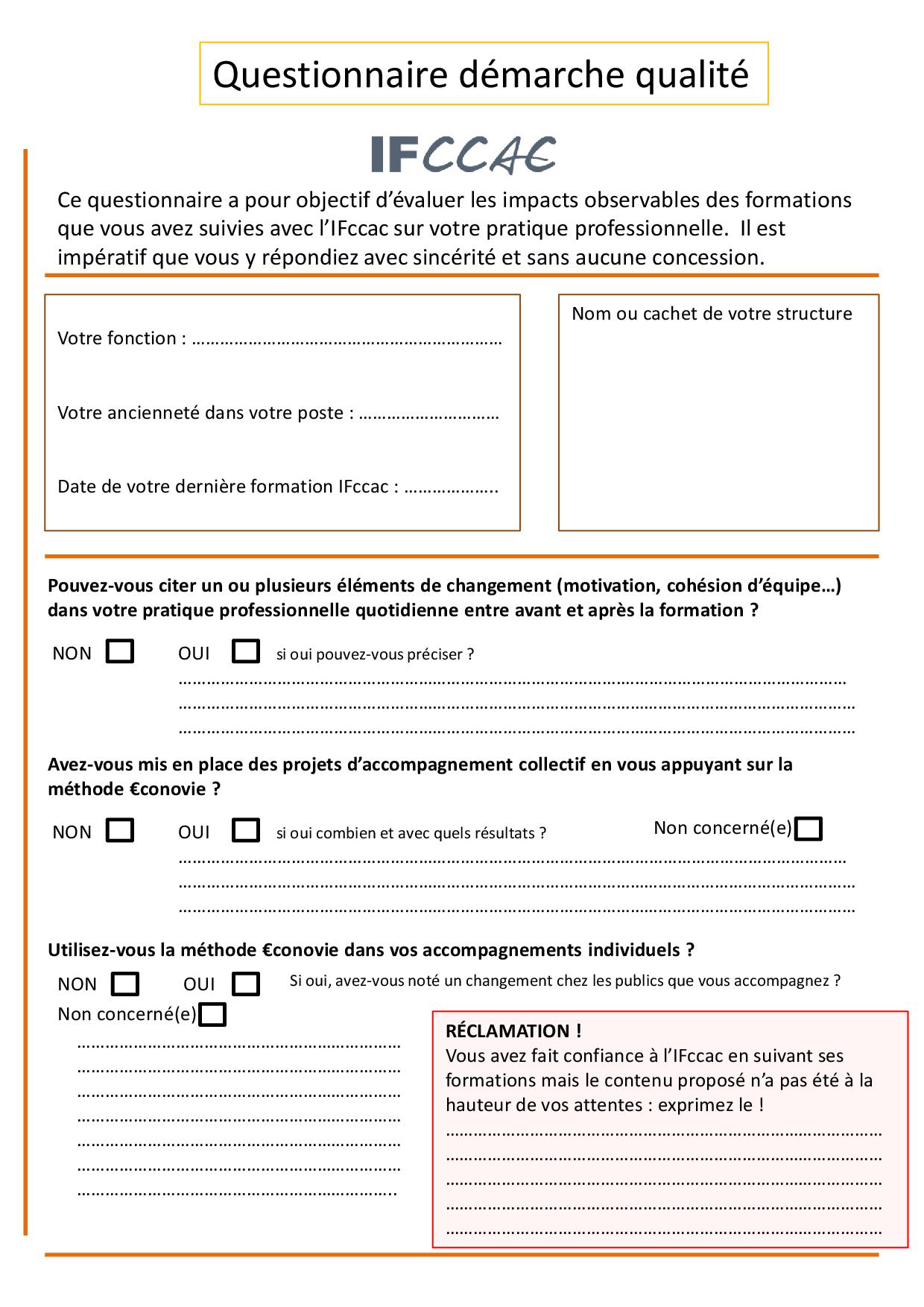 Par souci d’améliorer en permanence le contenu et la pertinence de son offre de formation, l’IFccac vous propose de remplir un questionnaire pour évaluer « à froid » les effets et les impacts des formations proposées. Il vous ait également possible de formuler une réclamation en cas d’insatisfaction.